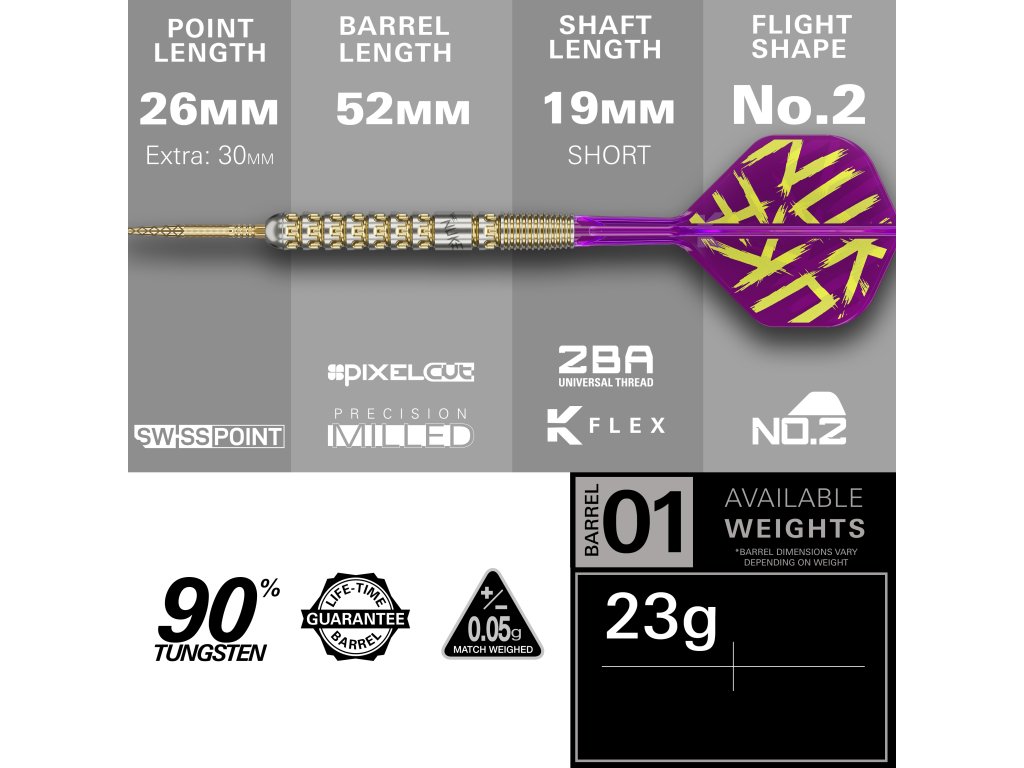 Šipky s vysokou hustotou 90% wolframu jsou precizně zkonstruovány a pečlivě přepracovány tak, aby vytvořily složitou kombinovanou šipku, která zahrnuje technologii rukojeti Pixel.