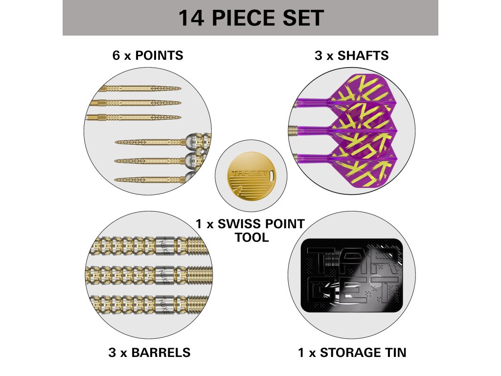 Obsah balení: 1x sada šipek (3 ks), 1x sada hrotů 30mm Gold Swiss DX, 1x sada Premium Gold Swiss Point Keyring Tool (3 ks) a 1x pelchová krabička.