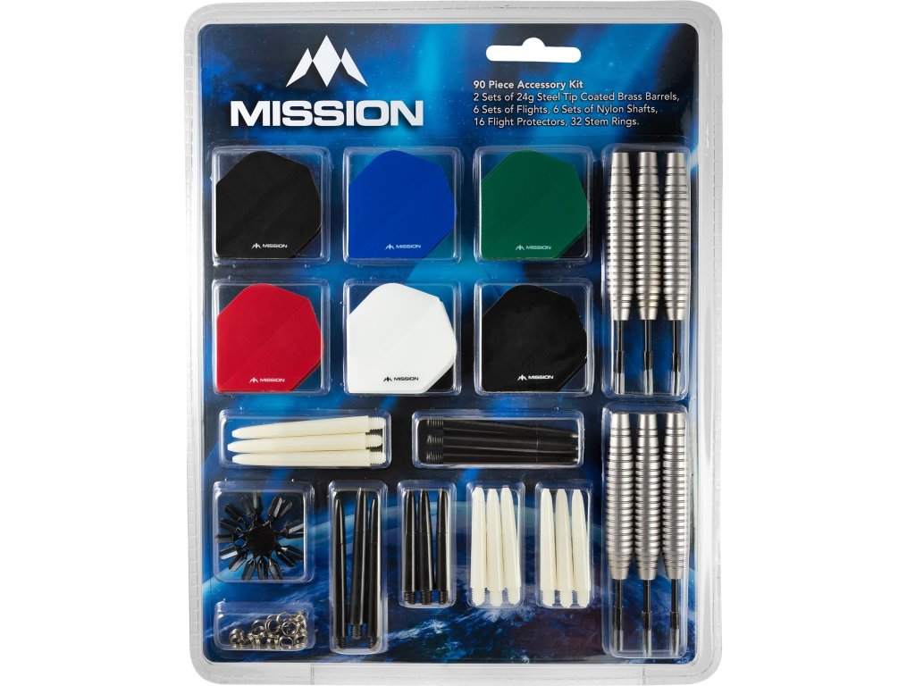 2 sady steelových Brass tungsten lock tělíček s hroty, 6 sad letek, 6 sad násadek, 16ks plastových chráničů letek, 32ks pružinek na plastové násadky.