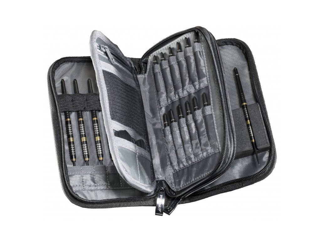 Penálové pouzdro od firmy Winmau je na jednu sadu šipek, náhradní letky, násadky a hroty.
