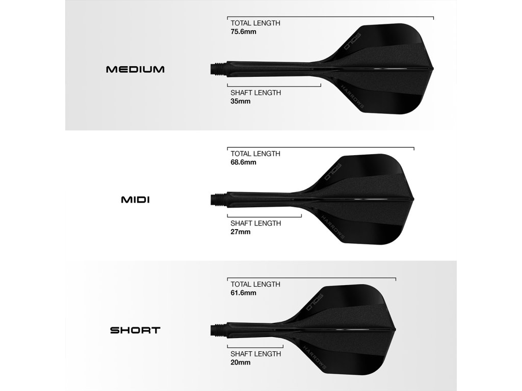 Dostupné ve velikostech Short (20 mm násadka, 61,6 mm celek), Midi (27 mm násadka, 68,6 mm celek) a Medium (35 mm násadka, 75,6 mm celek).
