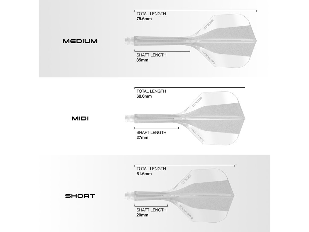 Dostupné ve velikostech Short (20 mm násadka, 61,6 mm celek), Midi (27 mm násadka, 68,6 mm celek) a Medium (35 mm násadka, 75,6 mm celek).