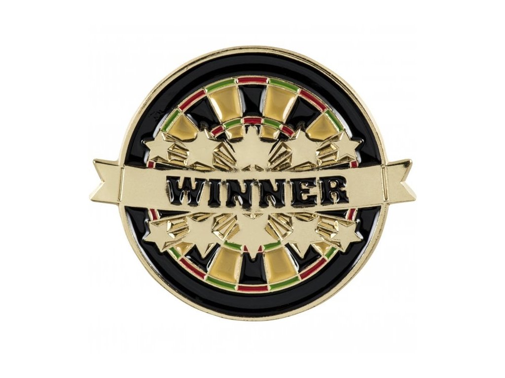 Odznak terče s malým bannerem na kterém je černý nápis WINNER (vítěz).