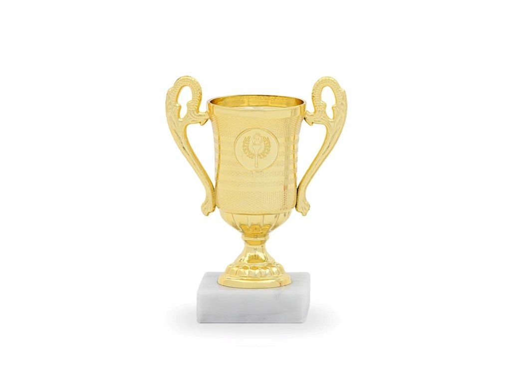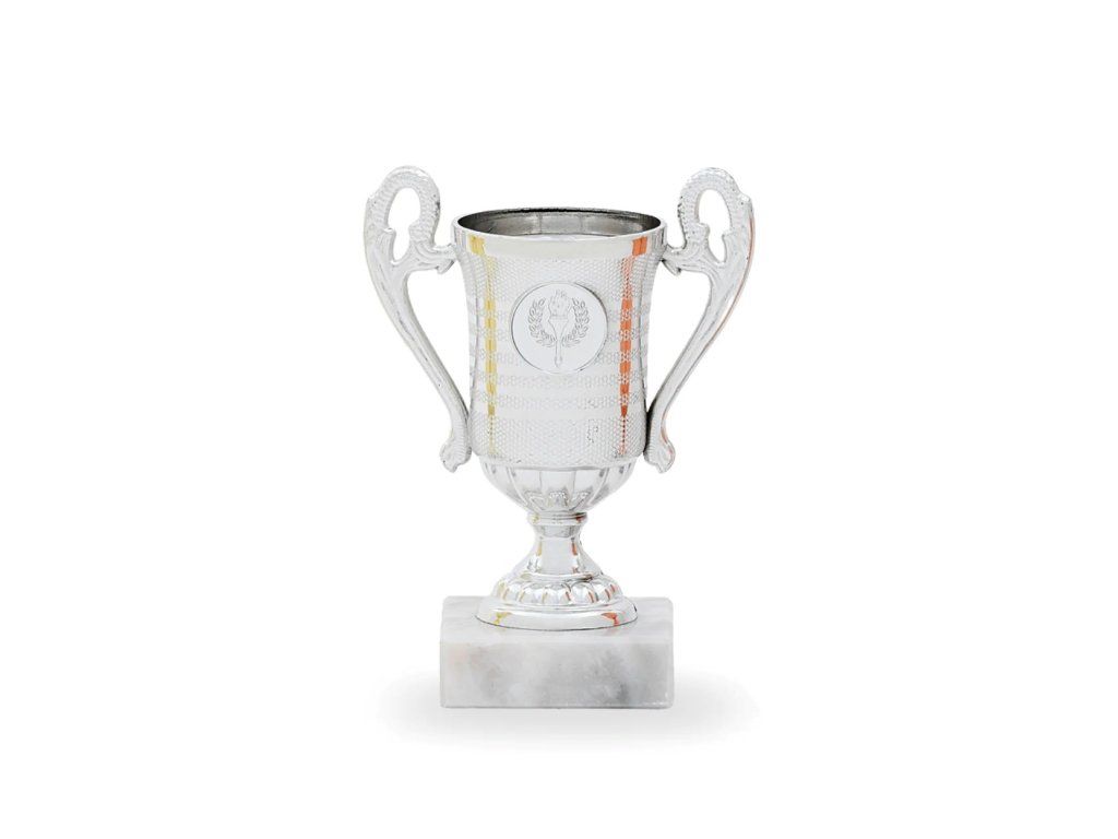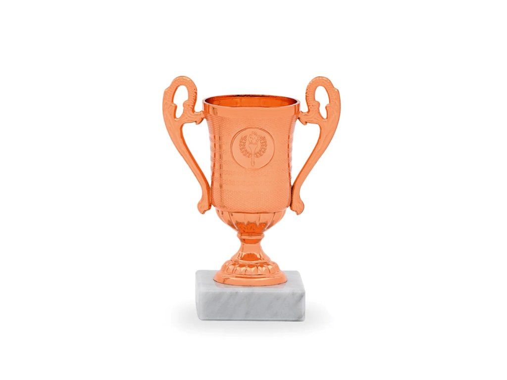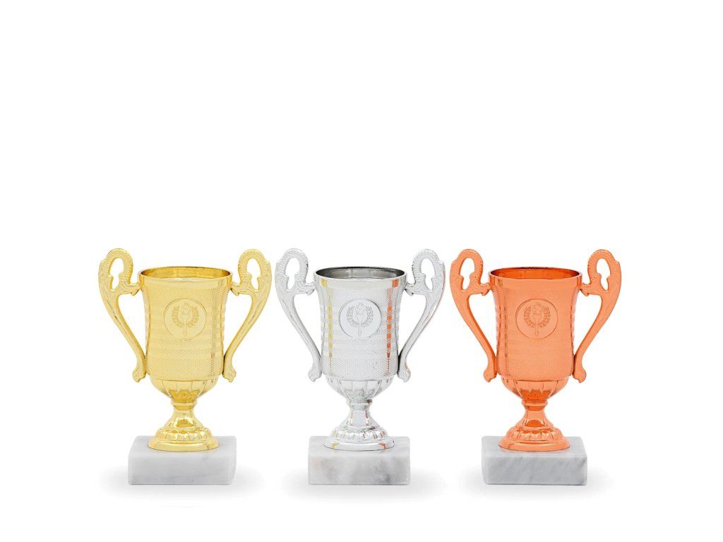 Poháry plastové 33015 ve variantách zlatá, stříbrná, bronzová s mramorovým světlým podstavcem výšky 15cm , průměr 60mm s oušky.