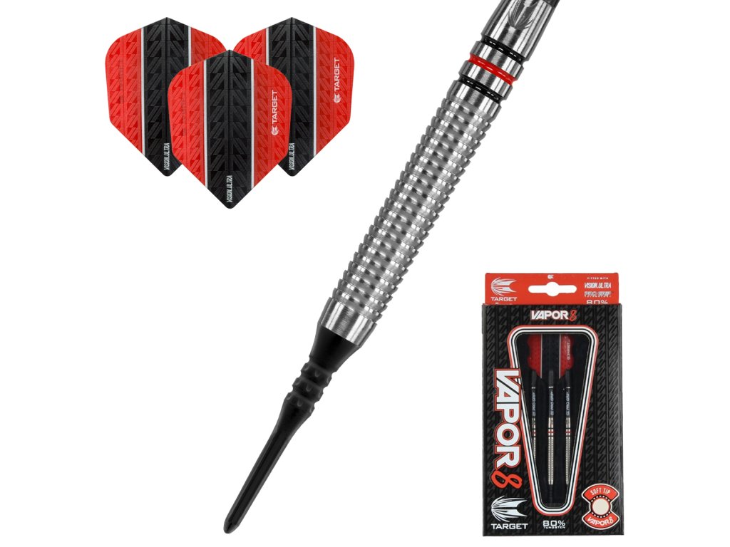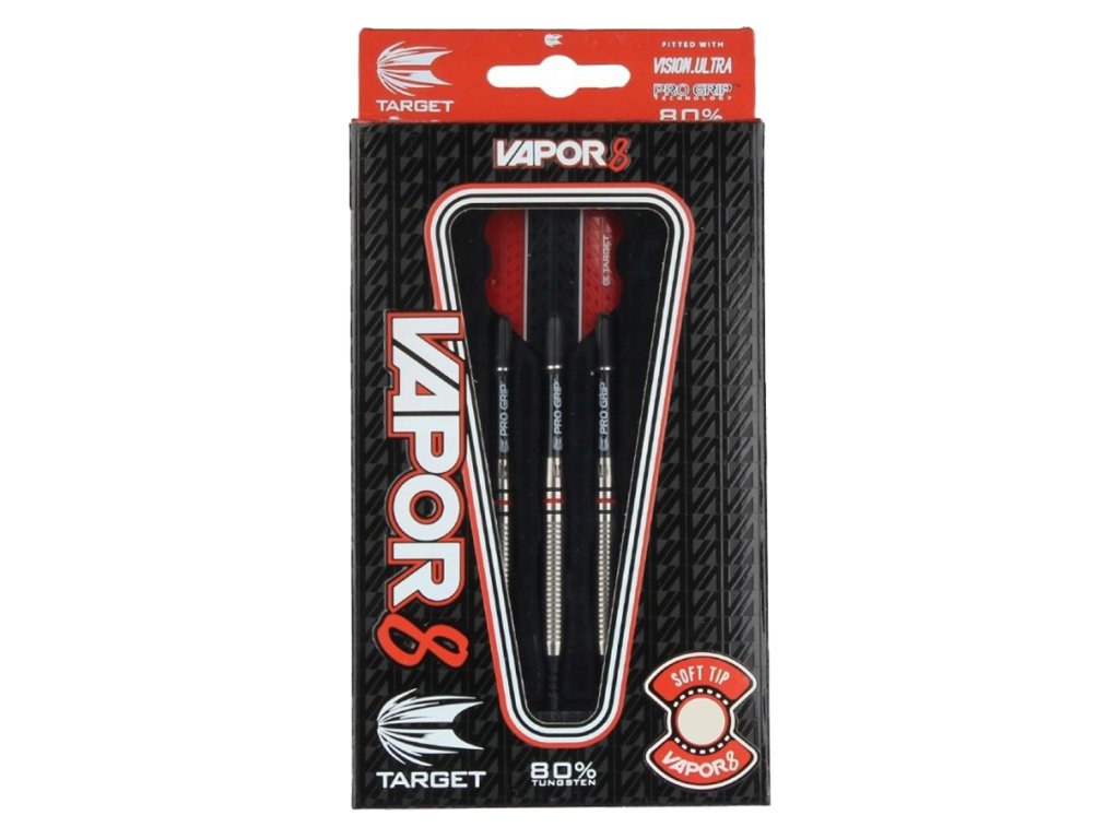 Tyto softové šipky s 80% wolframem jsou vyrobeny s vysokým výkonem tělíčka (barrelu) a se skvělým vyvážením šipky. Řada šipek VAPOR 8 zahrnuje širokou škálu tvarů, hmotností a vzorů barrelu ve výrazné červeno/černé barvě.
