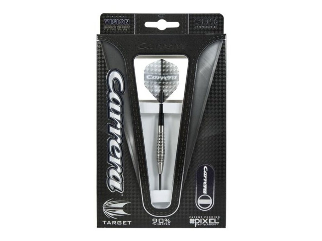Šipky Carrera C17 steel mají těla ze slitiny z 90% tungstenu a jsou kompletovány s plastovými hroty Pixel, Pro grip násadkymi a letkami Vision 100micronů.