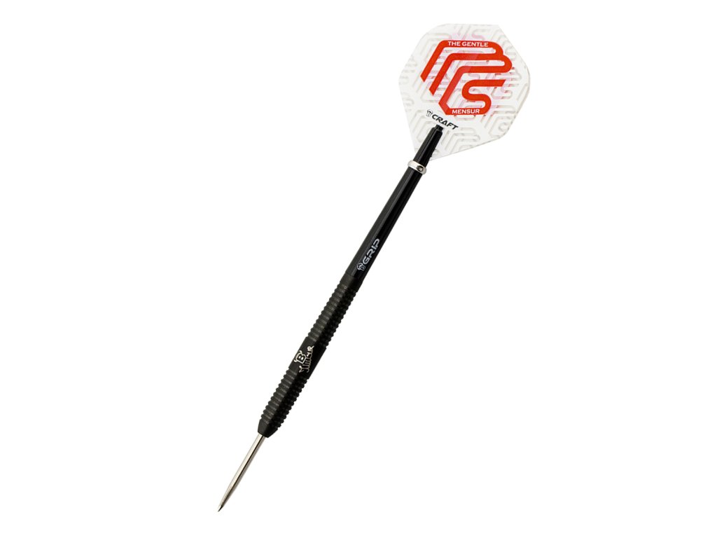 Velmi jemný prstencový úchop na černém barrelu je přerušen pouze logem BULL'S s podpisem hráče Mensur.