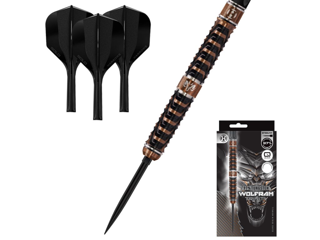 Wolfram Trinity se dodává s 26mm Quick Pointy (ocelové hroty), integrovanou letkou a násadkou Midi Black Solo a prémiovým nástrojem Wolfram Quick Point, což z něj činí kompletní a ihned po vybalení z krabice připravenou prémiovou sadu.