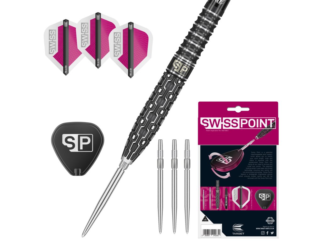 Swiss Point je patentovaný vyměnitelný hrotový systém, který vám umožňuje změnit délku, styl a barvu hrotů během několika sekund. Nástroj Swiss Point je kapesní nástroj, který je vše, co potřebujete k odšroubování a našroubování vašich hrotů. Patentovaný uzamykací systém využívá technologii kužele, která zajistí, že se vaše hroty během hry neuvolní, jsou stále zafixovány.