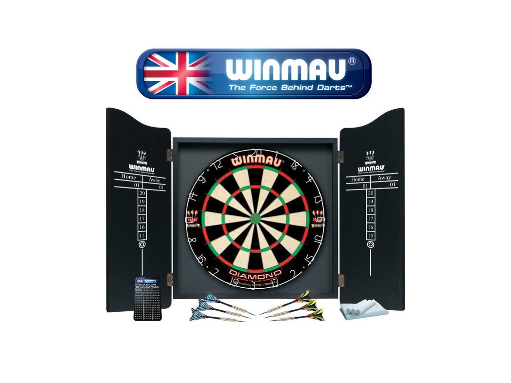 Obsahuje zavírací skříňku + sisalový terč Diamond + 2x šipky (6ks) o hmotnosti cca 20g + zavírací tabulku + křídy pro zápis a po stranách tabulky pro zápis score.