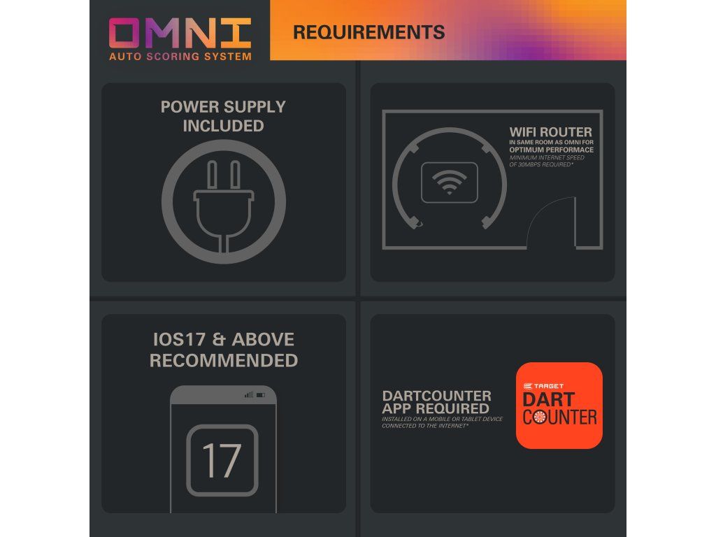 - OMNI SCORING SYSTEM je kompatibilní s většinou šipek a terčů s ocelovou špičkou soutěžních velikostí na trhu.