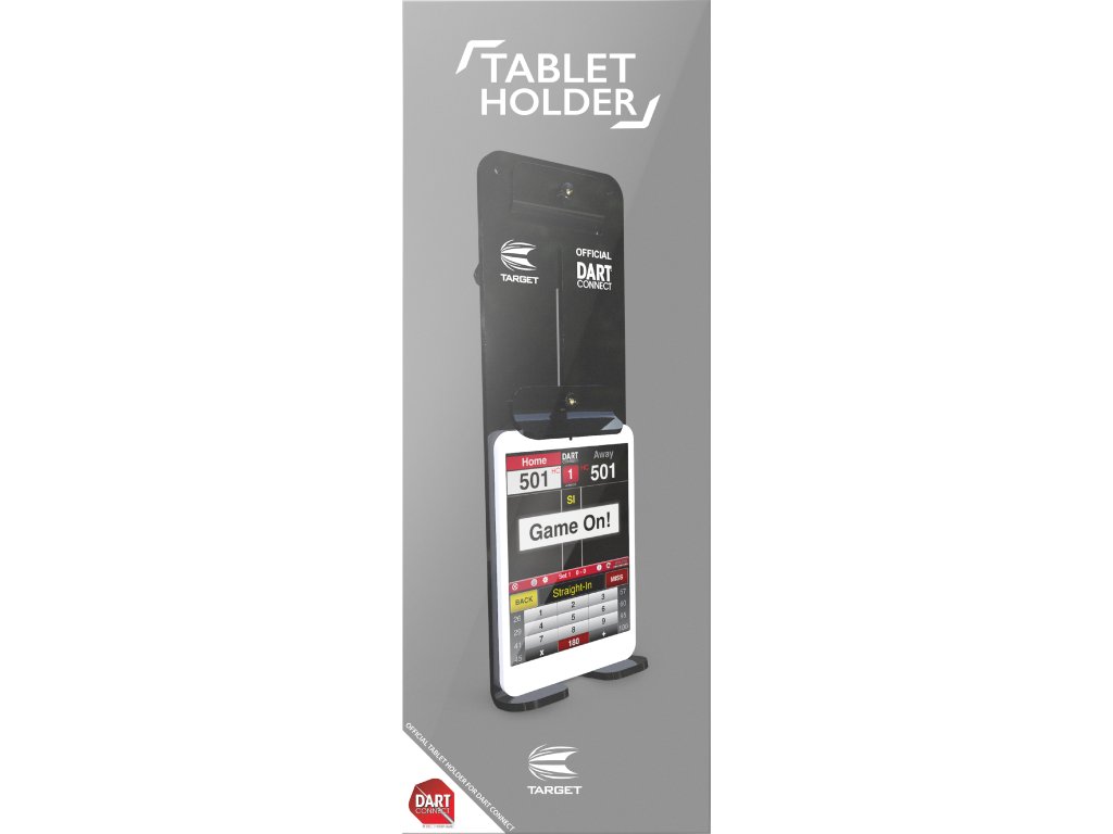 Praktický držák tabletu na zeď, který se umisťuje poblíž terče pro zapisování score.